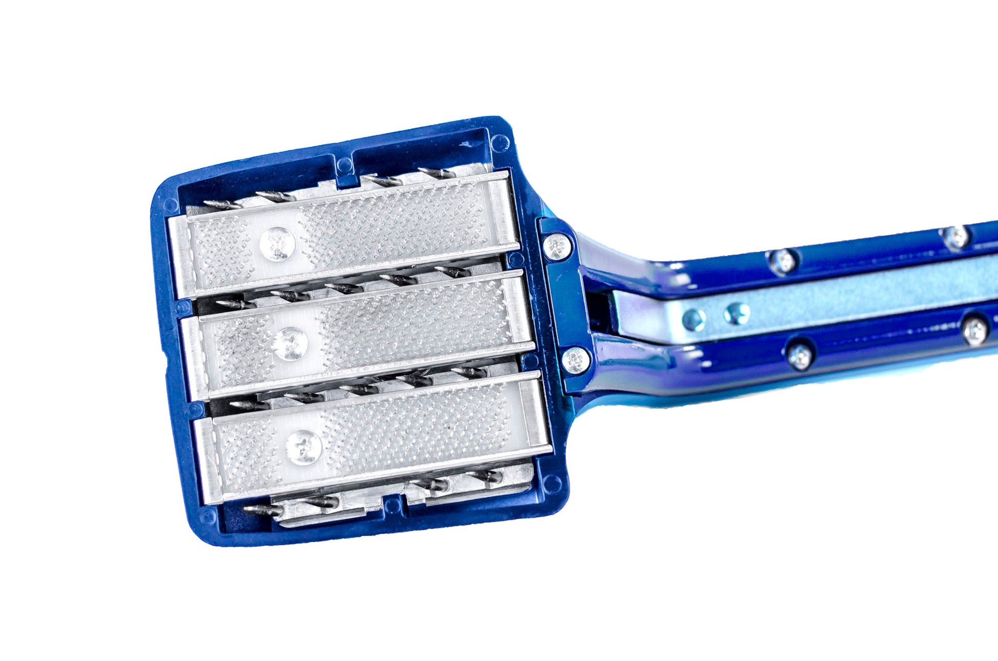 - El gatillo empotrado se bloquea a la longitud deseada con tres agarres de siesta y 16 pasadores de acero ajustables