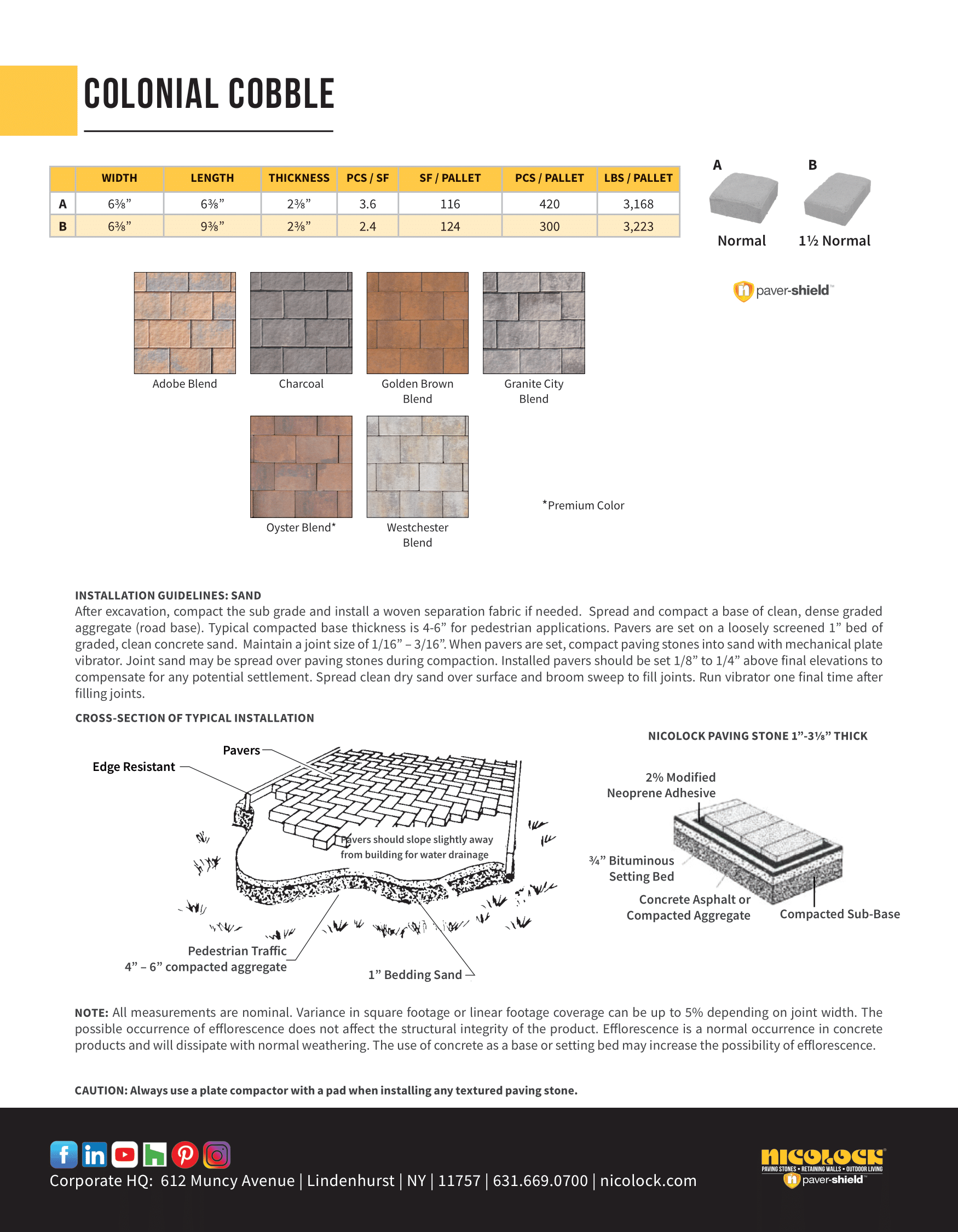 Los adoquines Colonial Cobble también utilizan la tecnología patentada Paver-Shield™ de Nicolock, que consiste en arena ultrafina, cemento Portland y colorante. El resultado es una superficie firme y lisa, con una resistencia excepcional, que le permite obtener adoquines confiables, hermosos y duraderos.