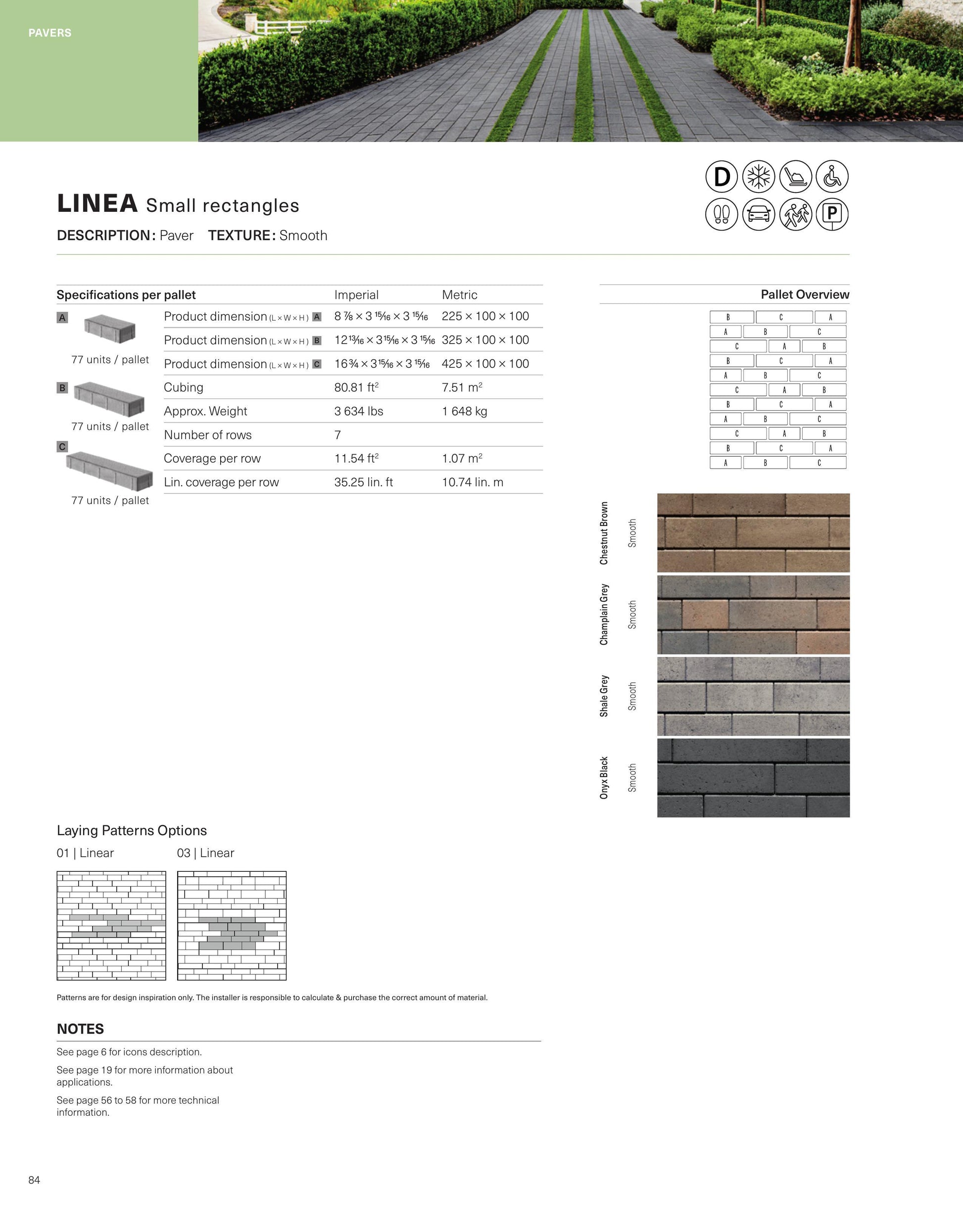 Para el epítome de los estilos contemporáneos de patio trasero y el diseño moderno del paisaje, el adoquín Linea es una opción ideal. Este adoquín está disponible en tres longitudes y dos anchos para las dimensiones de diseño que mejor se adapten a usted. Impresione a los invitados con su paisajismo instalando un solo ancho para lograr un estilo limpio, nítido y lineal, o combine ambos para un patrón elegante. Linea puede lograr estilos de alto contraste al mezclar neutros lineales con bandas oscuras o al mezclar superficies de alta textura con superficies lisas, mostrando una estética nueva y moderna de elegancia con un toque diferente. (vea el San Marino para un efecto de mezcla similar con una superficie altamente texturizada). Ideal para caminos de entrada, patios, pasillos o incluso cocinas al aire libre. Apto para vehículos y peatones. Este pavimento también es resistente a la sal descongelante, soporta climas severos y viene con una garantía de por vida transferible.