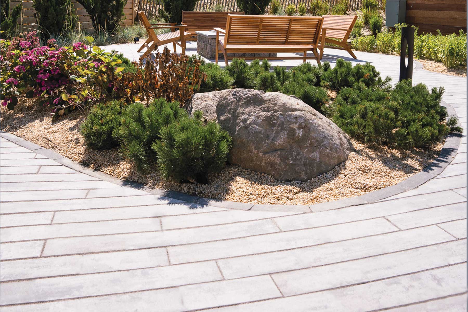 El estilo se refleja en los adoquines Montauk de Nicolock. Diseñados para durar más y tener un mejor rendimiento que los adoquines comunes, Montauk está impregnado de color y estilo puros. Con la tecnología paver-shield™ de Nicolock, los adoquines se fabrican mediante un proceso de fabricación de vanguardia junto con materiales medidos con precisión para una mezcla de base consistente y duradera. Durante el proceso de fabricación, el óxido de hierro se une a las moléculas de cemento para crear los colores más vibrantes posibles. El resultado es un color profundo y rico en todo el adoquín que dura año tras año.
