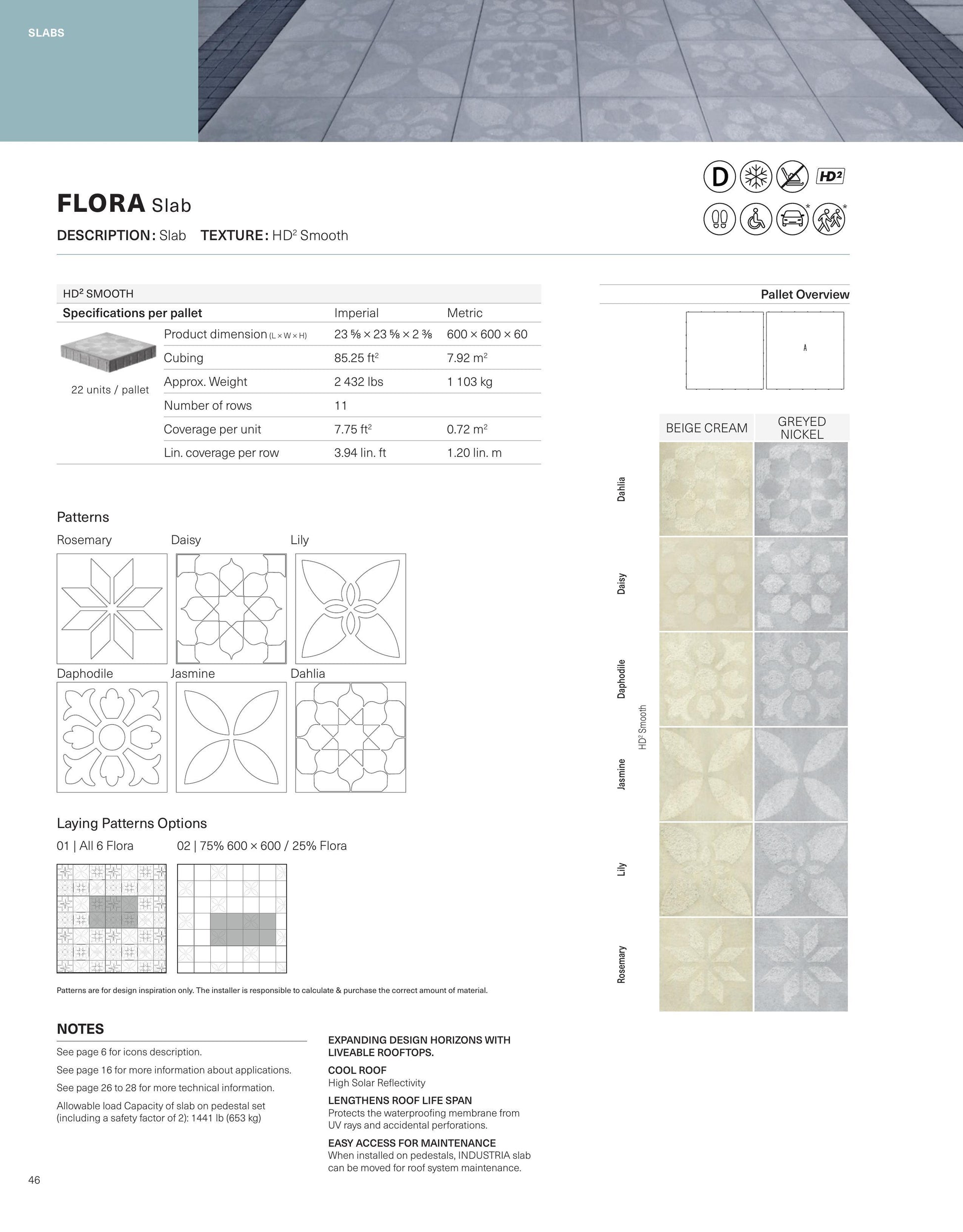 nspired by Mediterranean ceramics, the Industria Flora series brings soft and sophisticated visual interest to the outdoors with its textured floral patterns. This 600 x 600 slab, available in two staple colors and six different patterns, pairs perfectly with Industria Smooth 600 x 600 and offers unlimited design possibilities. Use in residential or commercial applications for full area patterns or decorative bandings.