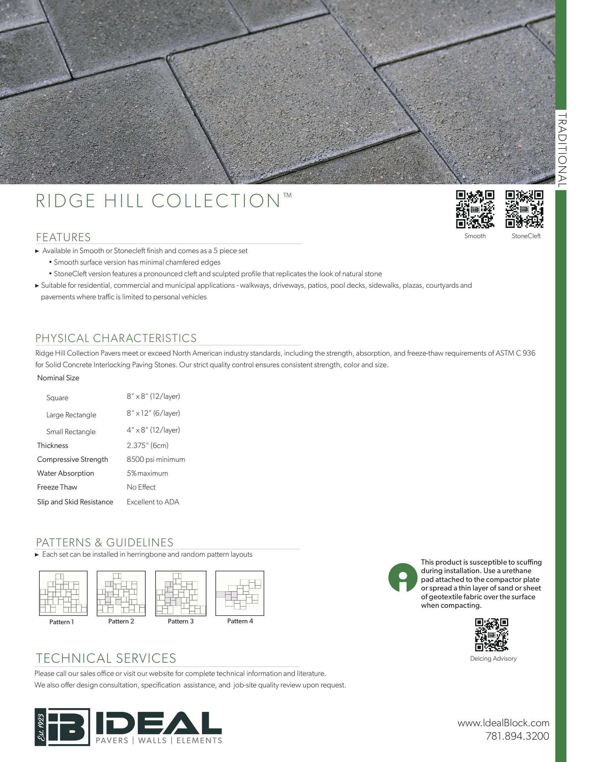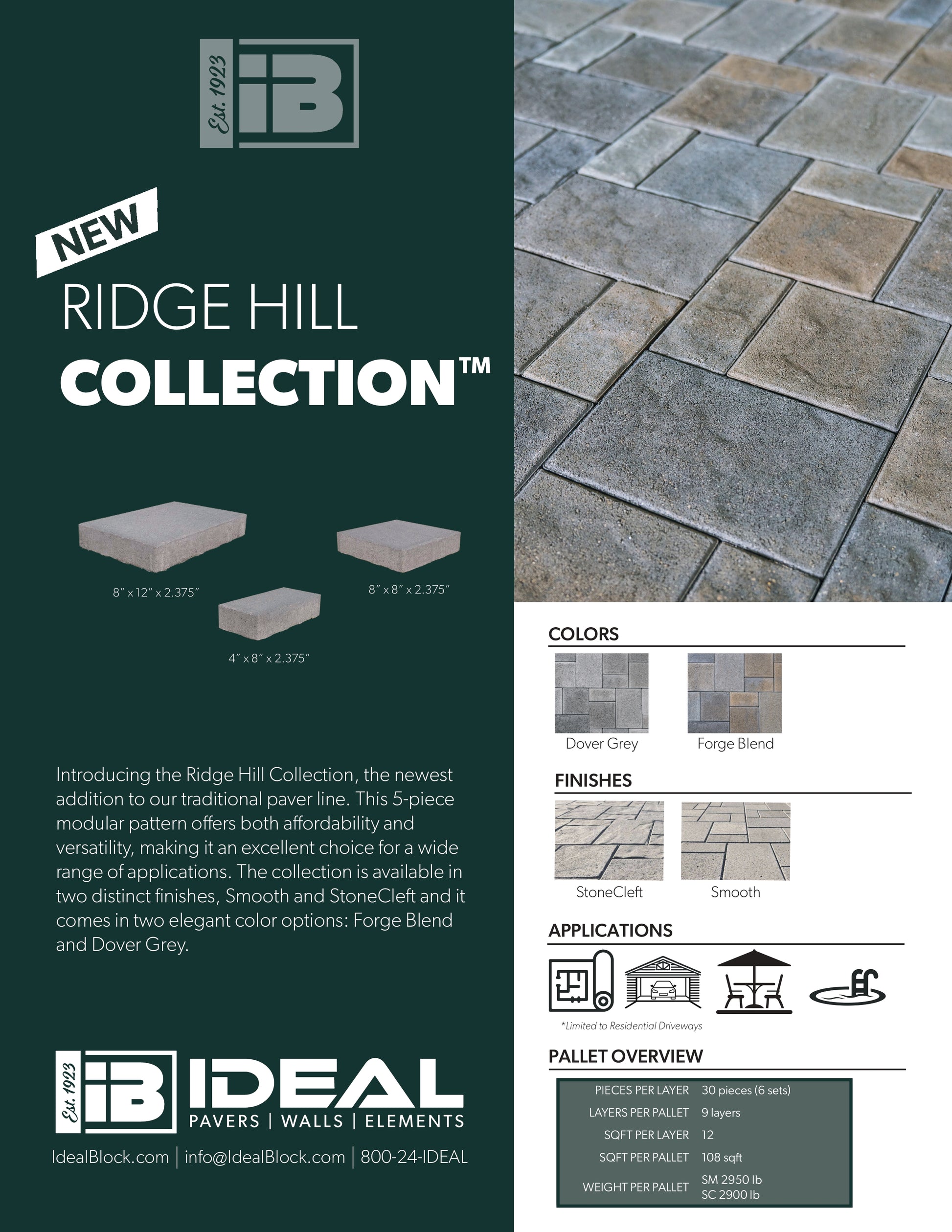 Introducing the Ridge Hill Collection, the newest addition to Ideal's traditional paver line. This 5-piece modular pattern offers both affordability and versatility, making it an excellent choice for a wide range of applications. The collection is available in two distinct finishes, Smooth and StoneCleft and it comes in two elegant color options: Forge Blend and Dover Grey.