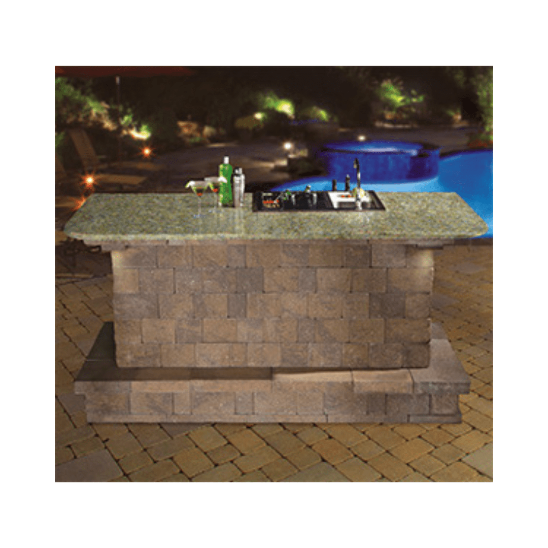 Este estilo vem completo com 2 paletes de MaytRx 6 Wallstones e um conjunto de bar central Bull™ de 30″ de primeira linha em uma bancada de granito polido em uma escolha de Black Uba Tuba ou Venetian Gold. O bar finalizado também possui um apoio para os pés que envolve três lados. Pronto para instalar... absolutamente NENHUM corte necessário. Instruções passo a passo em inglês e espanhol incluídas. Dimensões: 92″ de comprimento, 43″ de profundidade e 42″ de altura. MaytRx Split Face Sahara/Chestnut com granito Venetian Gold mostrado.